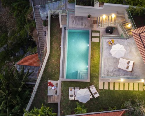 - One terrace ocean front overlooking the bay and an exterior garden surrounding the pool;